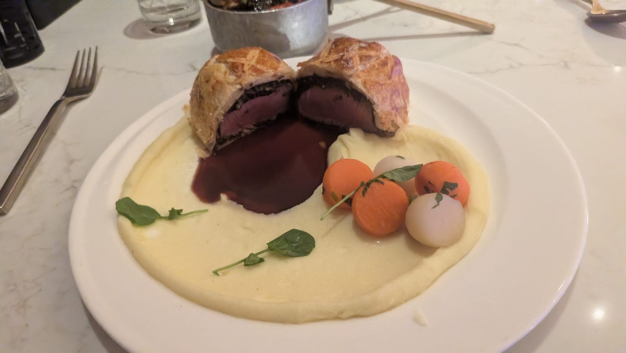 The time between the appetizers and entrees was long. Now it wasn't so long that we were complaining, but it was long enough that our server came to our table to let us know that the chef went to go check on it. We ordered a couple more cocktails (to the tune of $18-$25 each) and our food did indeed come out a few minutes later. My Beef Wellington looked amazing, as did the Brussels Sprouts, but Steph's steak, ordered medium and butterflied was neither. We asked our server, who apologized and took it back, leaving us staring at my entree, which Steph insisted upon me starting so it didn't get cold. She loved the Brussels and tried (and enjoyed) my Wellington, but it still wasn't great having her sitting around waiting for her food. It wasn't the end of the world though and her new steak came out relatively quickly, and we were set to enjoy our meals. I tried Steph's filet, and while good, I thought the Wellington was better, and after watching so many other items prepared and come out of the kitchen, I doubt we'd order that again.