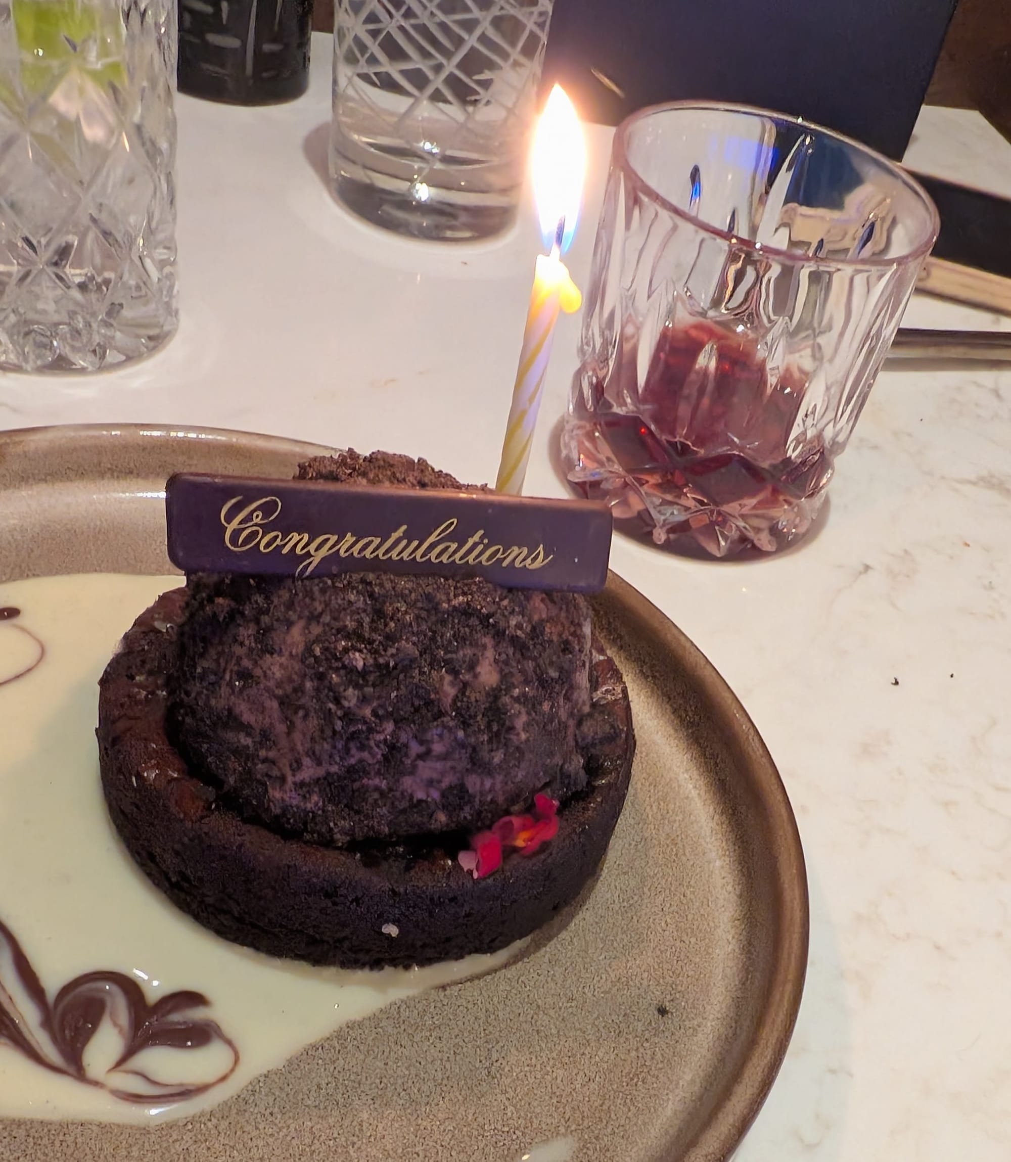We finished our entrees, and though we had the Sticky Toffee Pudding coming, we opted to take that to-go and get the Chocolate Sin Cake. They added a little "Congratulations" sign and candle, which was nice, and the dessert itself was amazing. Neither Steph nor I consider ourselves to be big dessert people, but we both loved it.