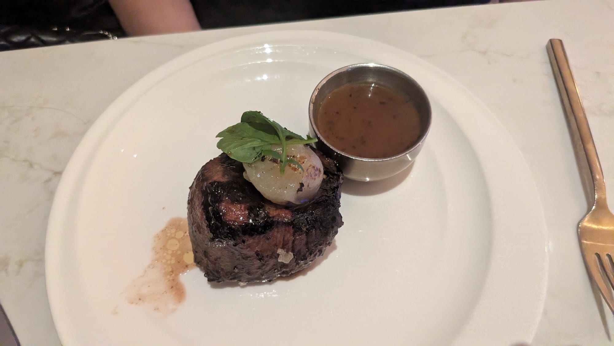 I ordered the prix fixe menu, which for $115, included pan-seared scallops, the Beef Wellington and sticky toffee pudding. We also got the Wagyu meatballs as an appetizer, and Steph got the 8oz filet mignon, ordered butterflied and medium and the Brussels Sprouts.