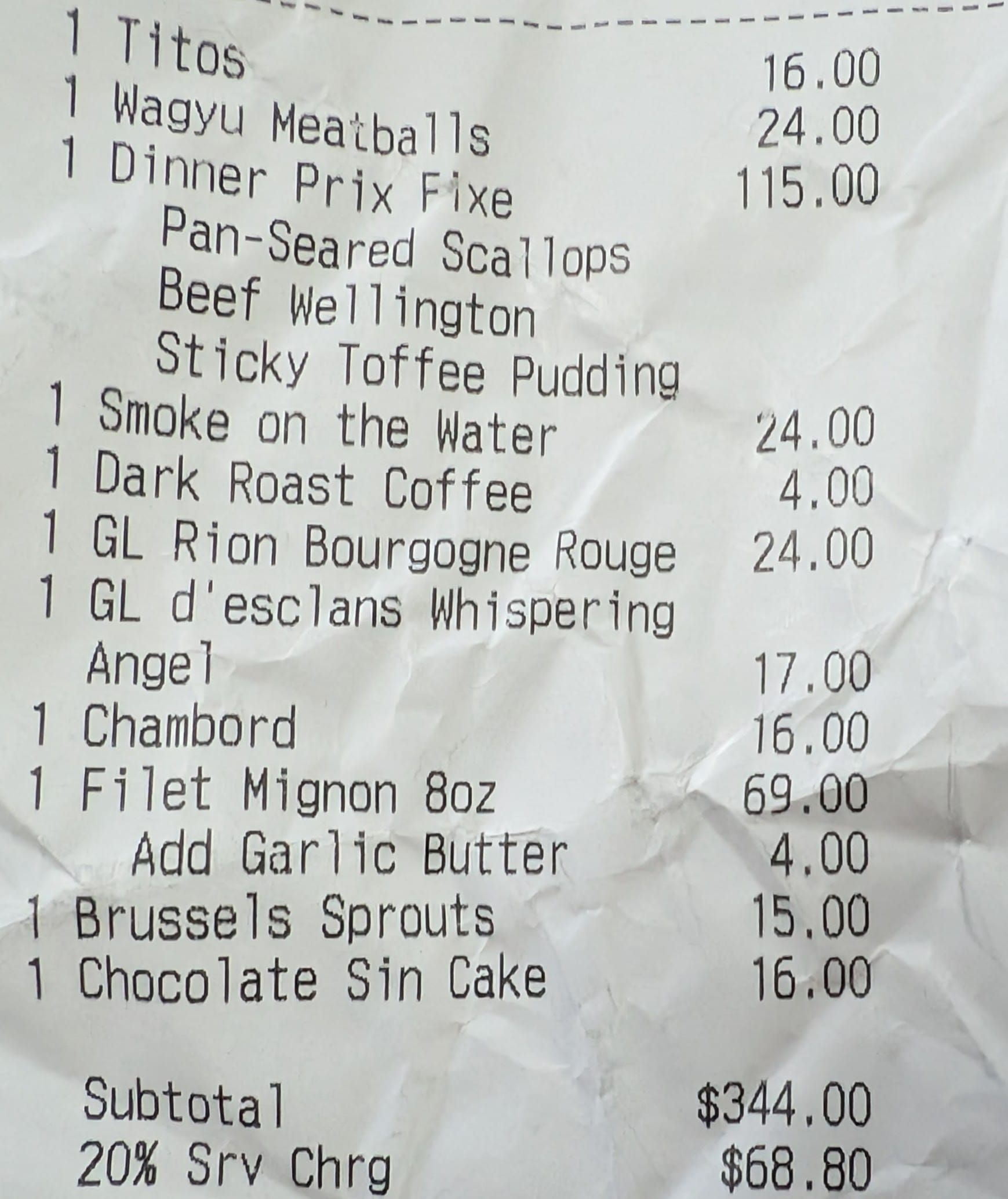 Our bill went from $344 to $412.80 with the "not a tip" service charge. We talked about it a bit, and while it would have been nice to have a cocktail or dessert comped for the long-wait or the incorrect order, nothing really rose to the level where we felt it was necessary. In the end, none of the issues we experienced were likely the fault of our server and we wanted to ensure she was compensated fairly, so we tipped an additional ~18% on the subtotal. Honestly, it was just awkward trying to figure out the right thing to do there. I would prefer they raise the service charge to 25% and let folks know that a standard 20% tip is included.