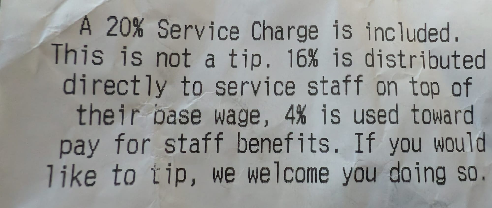 We finished dessert and got our check. On the menu, it says a 20% service charge is included, but I had read, and already knew that it really meant that it was added on to the final check, so as our server started to explain it, I let her know that I understood, and I thanked her and took the bill. Not her fault whatsoever, but I really dislike the direction this service charge thing is going in. I'm all for paying a good wage, and I have no issue tipping, or even over-tipping when warranted, but to charge 20% on top of the check and then tell folks it's not a tip, but that 16% goes to supplement the service staff wages seems bizarre, at least to me.